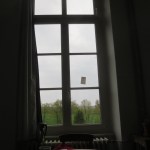 Der grosse, helle Saal, in dem wir schreiben und bewegen wird zum Raum über unseren Texten: Die weissen Wände. Der Holzboden. Die Säulen, die ihn in zwei Hälften teilen. Der Blick in den Park, der Blick ins weite Tal der Saône. Und wenn die blaue Türe zur Feuerleiter offen ist: Morgensonne, die auf den Holzboden fällt, wo wir sitzen und unsere Zettel, Decken und beschriebenes Papier liegen.