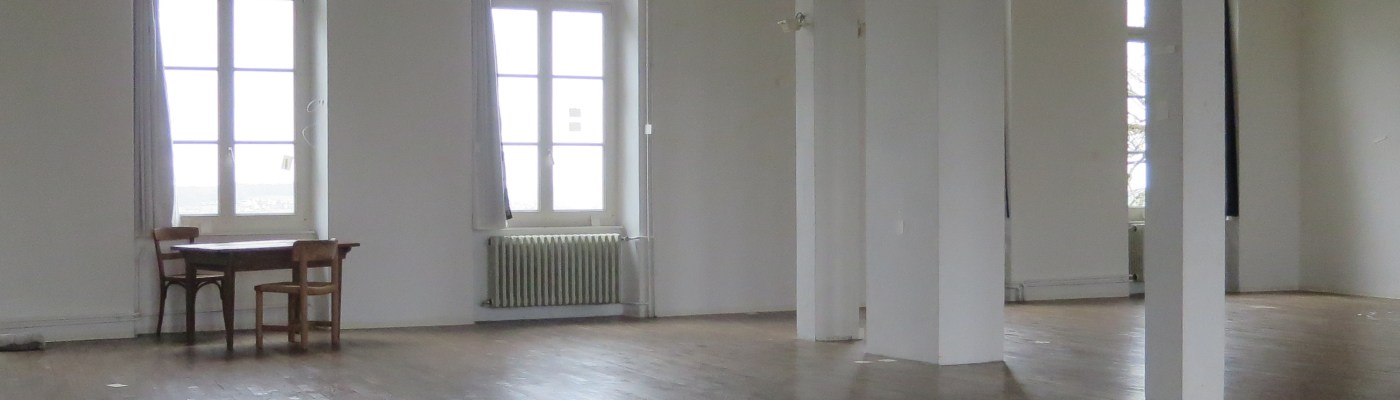 Der grosse, helle Saal, in dem wir schreiben und bewegen wird zum Raum über unseren Texten: Die weissen Wände. Der Holzboden. Die Säulen, die ihn in zwei Hälften teilen. Der Blick in den Park, der Blick ins weite Tal der Saône. Und wenn die blaue Türe zur Feuerleiter offen ist: Morgensonne, die auf den Holzboden fällt, wo wir sitzen und unsere Zettel, Decken und beschriebenes Papier liegen.